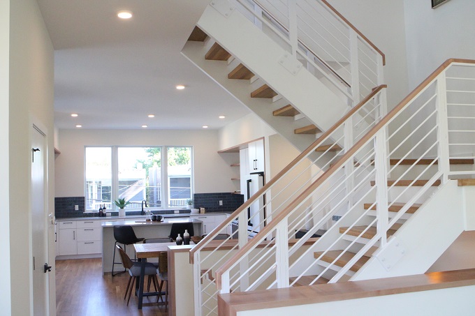With oversized windows and wood floors and accents, the homes are designed in a style called Japandi, which combines Japanese and Scandinavian aesthetics with a focus on organic surroundings. Skylights add more light to the rooms, which feature different floorplans with upstairs kitchens, bedrooms and bathrooms and a downstairs flex room that can be a third bedroom or office.